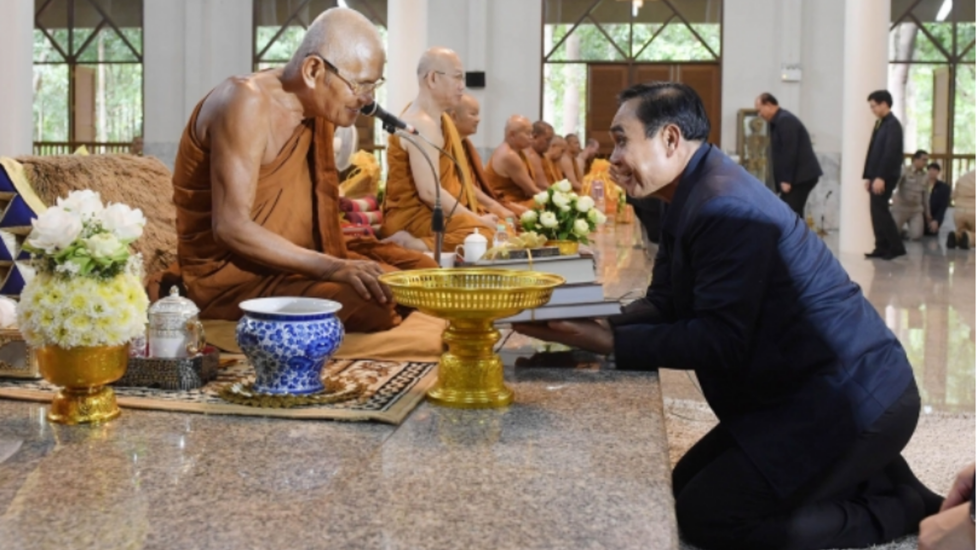 นายกรัฐมนตรีกราบสักการะพระอัฐิธาตุ ของพระโพธิญาณเถร (ชา สุภทโท) พร้อมนมัสการเจ้าอาวาสวัดหนองป่าพง และพระลูกศิษย์ของพระโพธิญาณเถร