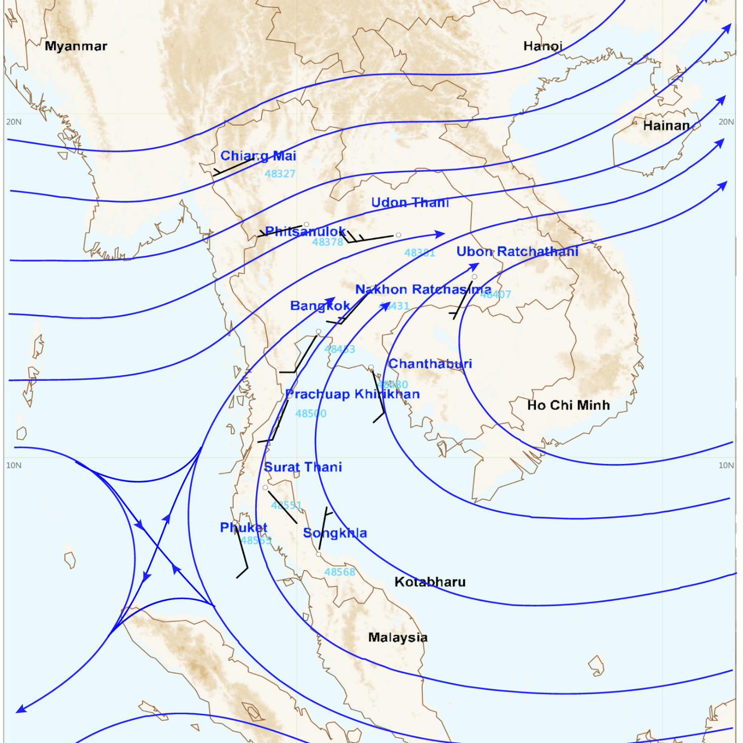 ลมตะวันออกเฉียงใต้ ความเร็ว 10-30 กม./ชม.